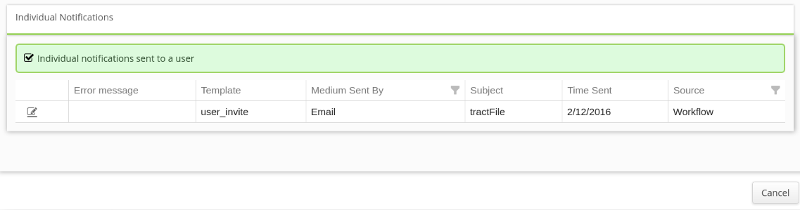 To access detailed information about the notifications click the View link to the left of a given notification from the grid page. This will bring up a window showing the Template, Medium Sent By, recipient (To), sender (From), Notification Status, Subject, Time Sent, Notification Body, and Source as well as any Individual Notifications sent to a list of individual users.