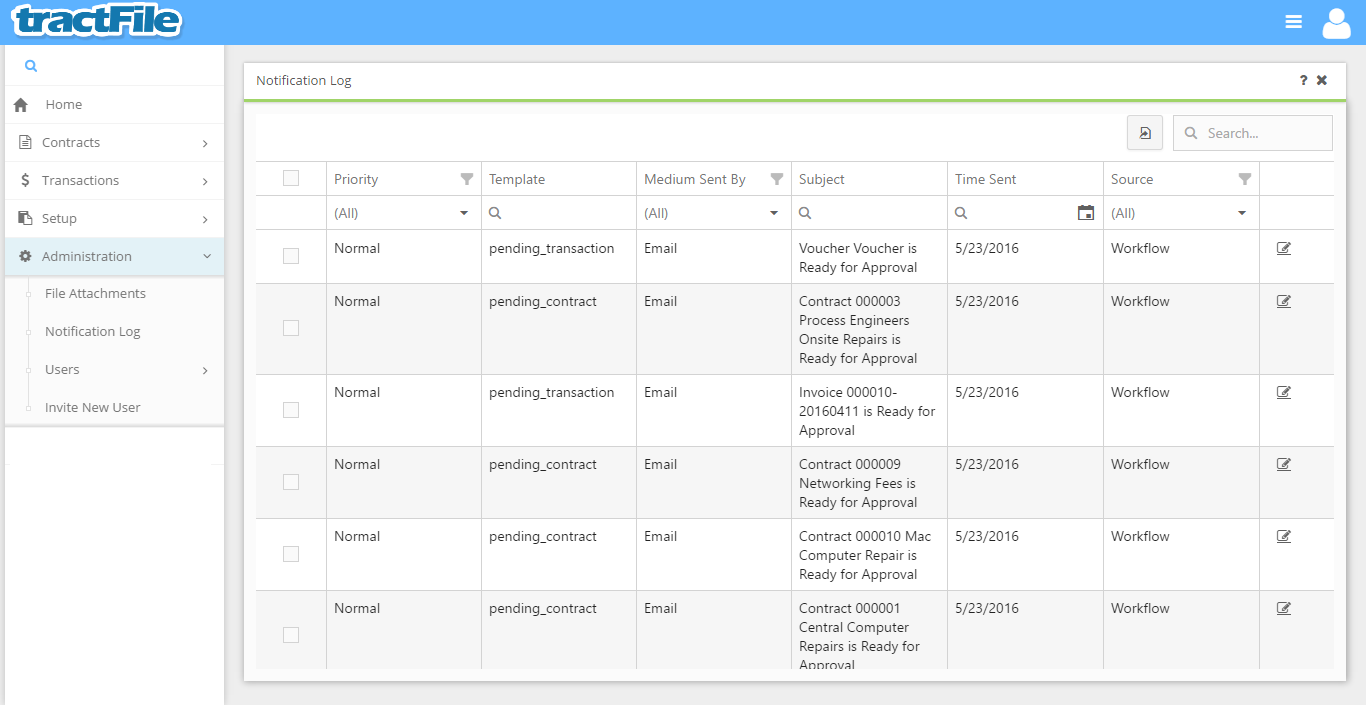 The navigation link to the Notification Log is located under the Administration panel in the menu bar. From the grid there is a list containing the Template used for the notifications, the Medium Sent By such as email notifications, the Subject of the notification, the Time Sent and the Source of the notification (Either through a Workflow or Scheduled Task).