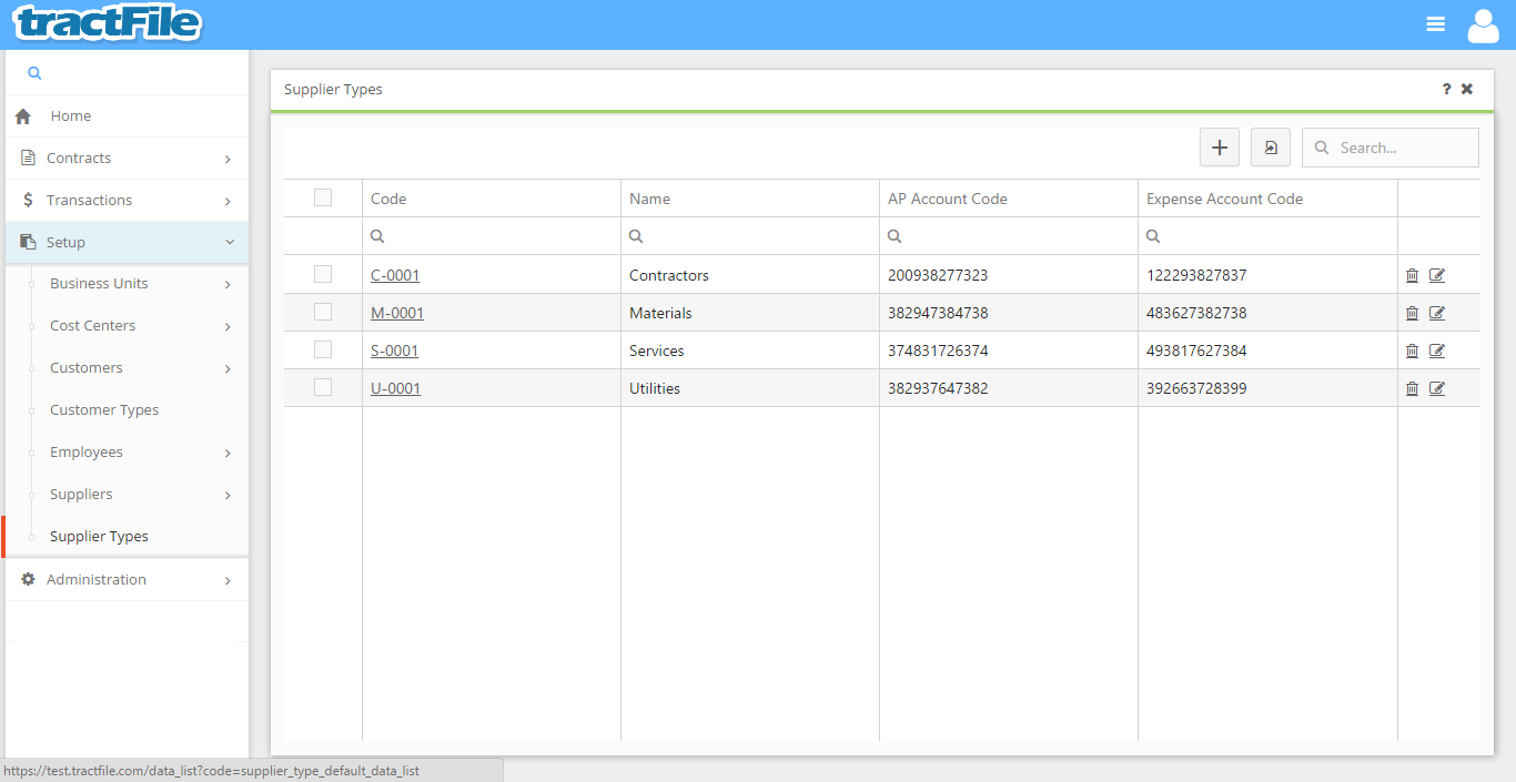 create button on the Supplier Types grid page, accessed under the main menu sub-heading Setup / Supplier Types, or in the same grid from within another form, (e.g. Supplier Contract).