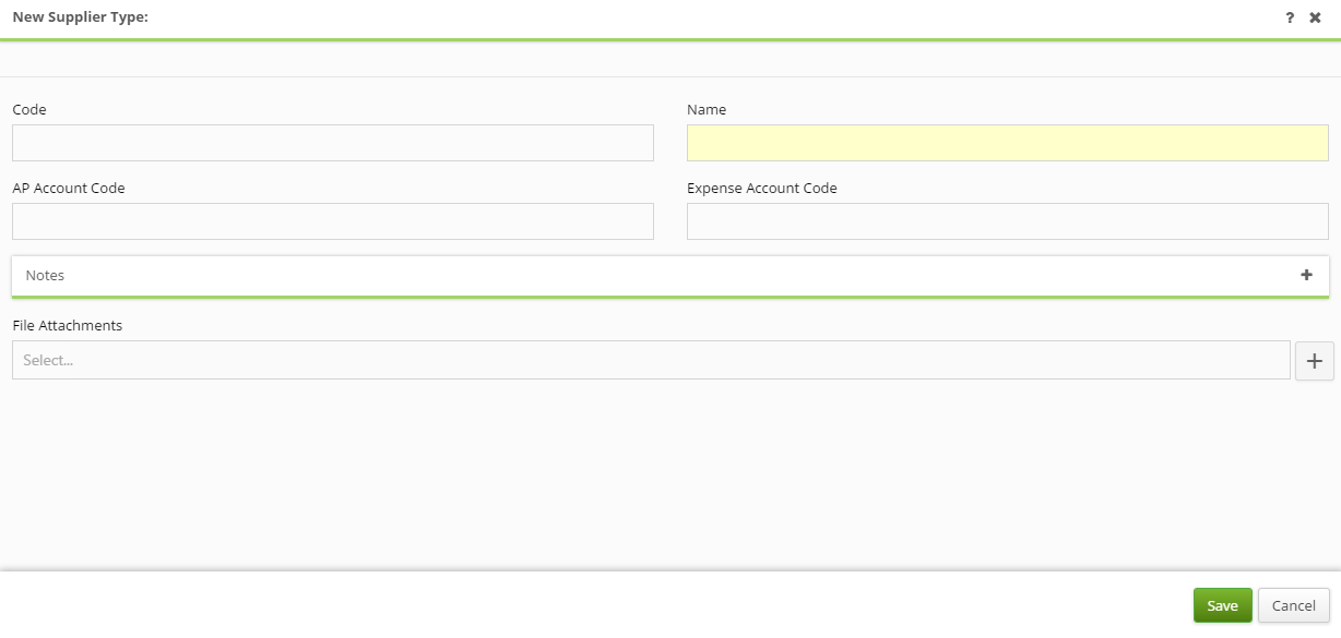 Upon doing so, a New Supplier Type form pop-up window will open. All yellow fields in the window are required to be able to save the form, while white fields are optional. Fill in the Code and Name, as well as the AP Account Code, Expense Account Code, and any Notes you wish to add. Finally, you can add any desired attachments by clicking the + button in the File Attachments field towards the bottom of the screen.