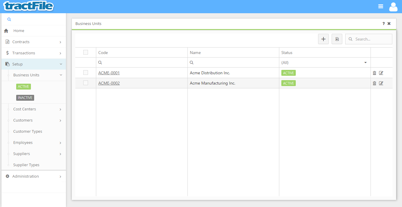create button, either on the Business Unit grid accessed under the Setup tab in the main menu, or the same grid from within another form (e.g. Supplier Contract).