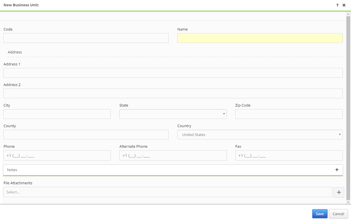 Doing so will open a new pop-up window with a New Business Unit form. All yellow fields in the window are required to save the form, while white fields are optional. Enter Code, Name, Address, Phone Number, Alternate Phone Number, and Fax. You can also add any Notes you wish towards the bottom of the form. Finally, it is also possible to upload additional files by clicking the