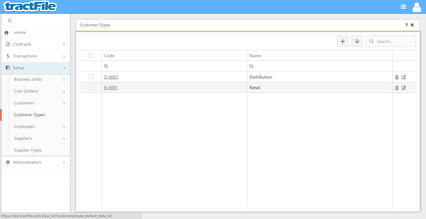 To create a new Customer Type, click the + button on the Customer Types grid page, accessed under the main menu sub-heading Setup / Customer Types, or in the same grid from within another form, (e.g. Customer Contract).