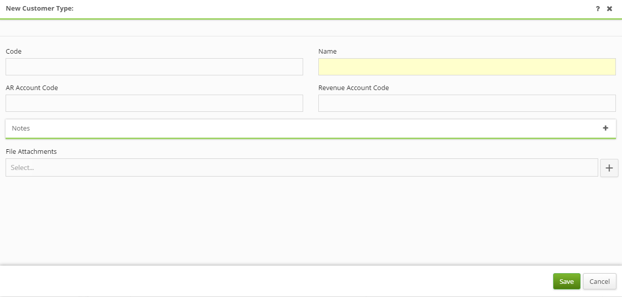 Upon doing so, a New Customer Type form pop-up window will open. All yellow fields in the window are required to be able to save the form, while white fields are optional. Fill in the Code and Name, as well as the AR Account Code, Revenue Account Code, and Notes as needed. Finally, add any desired attachment by clicking the + button in the File Attachments field towards the bottom of the screen.